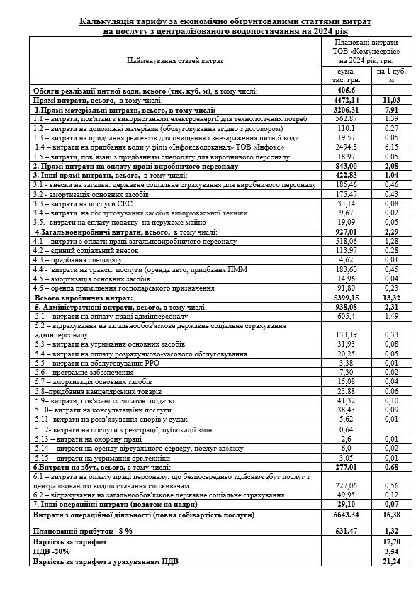 - тариф на послуги з централізованого водопостачання в розмірі – 21,24 грн., в т.ч. ПДВ;